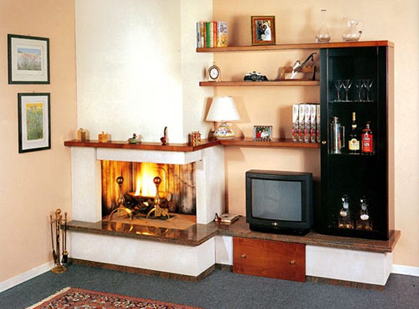 Semineu modern, amenajat cu o bibliotecă, realizat în întregime din marmură, cu zidărie tencuită decorativ și, după preferințele clientului, lemn de fag