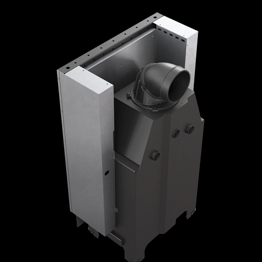 Focarul este prevazut cu deschidere verticala, prin glisarea usii, oferind un plus de confort acestuia. Usa este prevazuta si cu deschidere standard, orizontala, pentru o curatare usoara a sticlei. Focarul este echipat la nivelul conului cu sistem de recuperare a caldurii, compus din tevi orizontale ce preiau din caldura gazelor de evacuare, crescand eficienta acestuia. Datorita samotei din interior si a sistemului de ardere pe vatra, procesul de ardere al lemnului este mai complet, rezultand reziduri de cenusa reduse. Pe conul focarului este amplasata o evacuare reglabila la 360 grade, pentru o racordare facila a acestuia la cosul de fum.