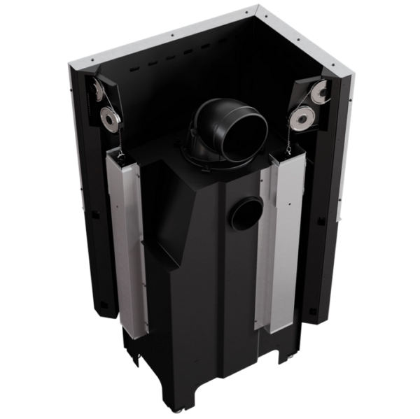 Focar cu sticla pe doua laturi, prevazut cu deschidere vericala, cu sistem de glisare a usii, ce ofera un plus de confort la utilizarea acestuia. Usa este prevazuta si cu deschidere stadard, orizontala, pentru o curatare usoara a sticlei. Pentru recuperarea caldurii, in conul focarului este amplasata o teava orizontala, ce mareste suprafata de schimb termic, crescand astfel eficienta focarului. Datorita samotei de la interior si a sistemului de tripla combustie, procesul de ardere al lemnului este mai eficient si mai economic. Focarul este dotat cu racord reglabil la 360 grade, pentru o racordare facila a acestuia la cosul de fum.