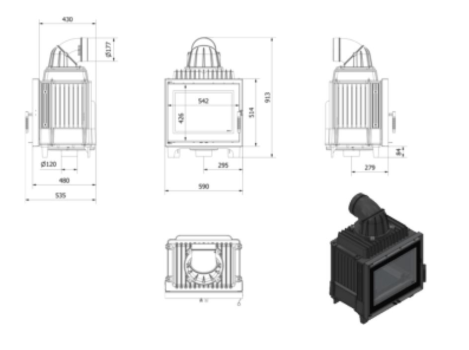 Pe conul focarului, este amplasata o evacuare ajustabila, compusa din 2 piese mobile, ce permite racordarea la cosul de fum, atat la 180 cat si la 90 grade. Acesta nu este pretentios in ceea ce priveste cosul de fum, avand evacuare cu diametru de dimensiune mai mica. Usa focarului este confectionata din otel. Focarul beneficiaza de un sistem de tripla combustie de aer, cu perete dublu de fonta cu aer preincalzit, pentru un randament mai bun, cat si de un sistem triplu de reglaj al aerului, pentru un control cat mai bun asupra procesului de ardere. Sticla decorativa rezistenta la caldura, care poate suporta temperaturi de pana la 660°C. Ofera semineului un aspect modern si elegant.