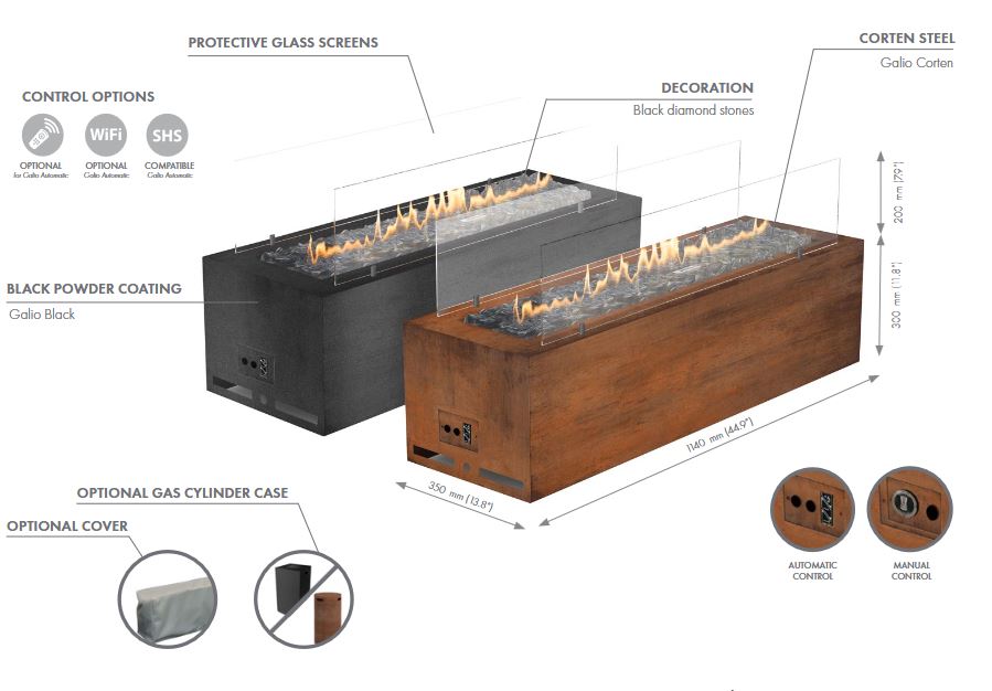 Galio Black este un șemineu liniar pe gaz cu un aspect negru elegant, care se va combina perfect cu orice stil al spațiului tău exterior. Designul său unic și forma portabilă vor crea o decorare convenabilă și ușor de utilizat a grădinii tale. În funcție de tipul de combustibil ales, puterea termică maximă a acestui șemineu liniar pe gaz pentru exterior poate varia de la 9,4 kW (GPL) la 11,8 kW (NG), oferindu-vă o căldură plăcută.