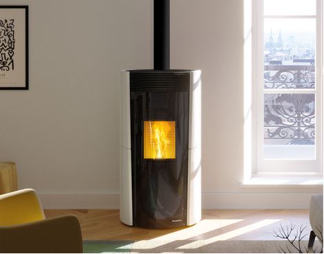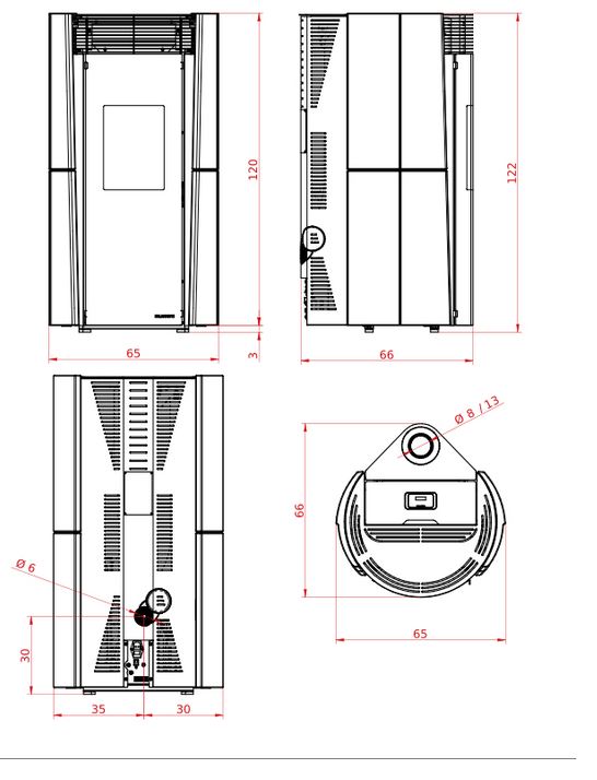 Ușă dublu-vitrată; geamul exterior este temperat și de culoare neagră, devenind transparent atunci când focul este aprins