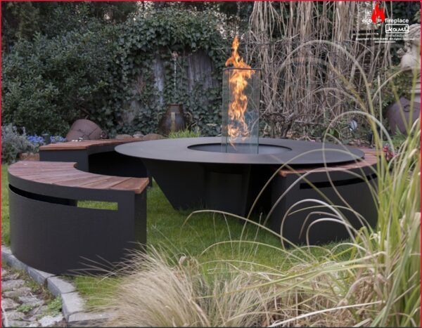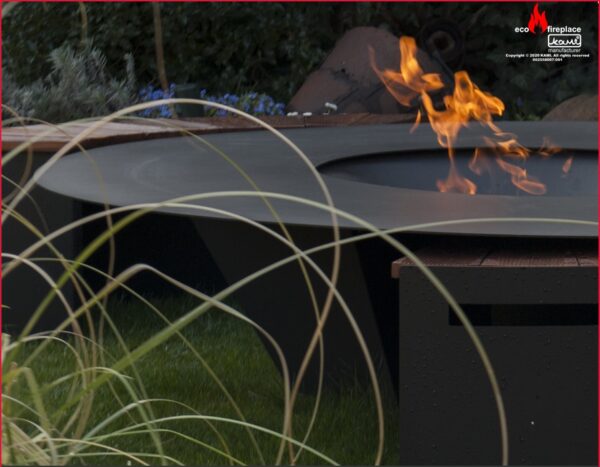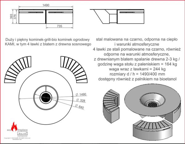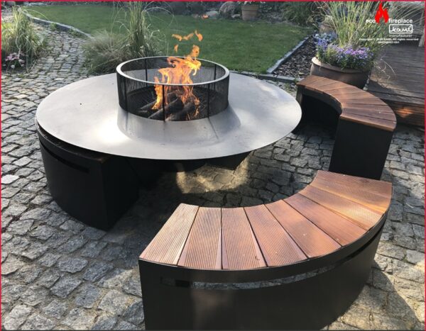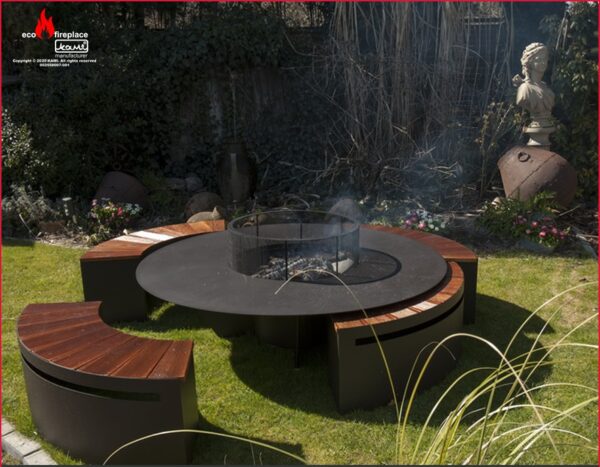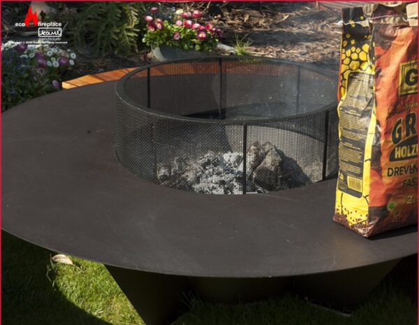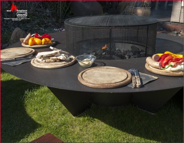 Modelul este din otel de 3 mm, vopsit cu vopsea termorezistenta, o masa mare cu diametrul de 150 cm cu vatra in mijloc pentru lemne.