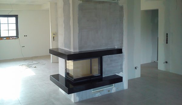 Constructie semineu in stil modern, cu vedere pe doua laturi a focului. Acesta a fost realizat din granit negru. Focarul cu deschidere verticala, din otel de inalta calitate si samota la interior. Materialele, cat si focarul se pot alege in functie de preferintele clientului.