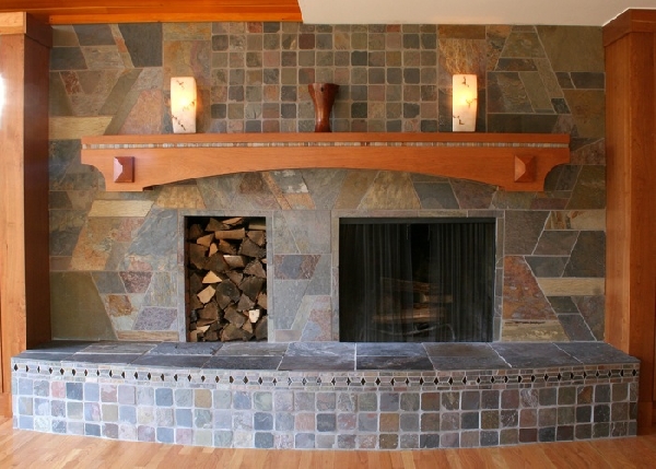 Semineu modern cu placat cu ardezie sub diferite forme, focar fonta, blat lemn.