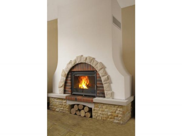 Semineu rustic realizat din piatra cioplita, caramida si blaturi din Vratsa. Hota cu lateralele construite tip arcada pentru un plus de eleganta.