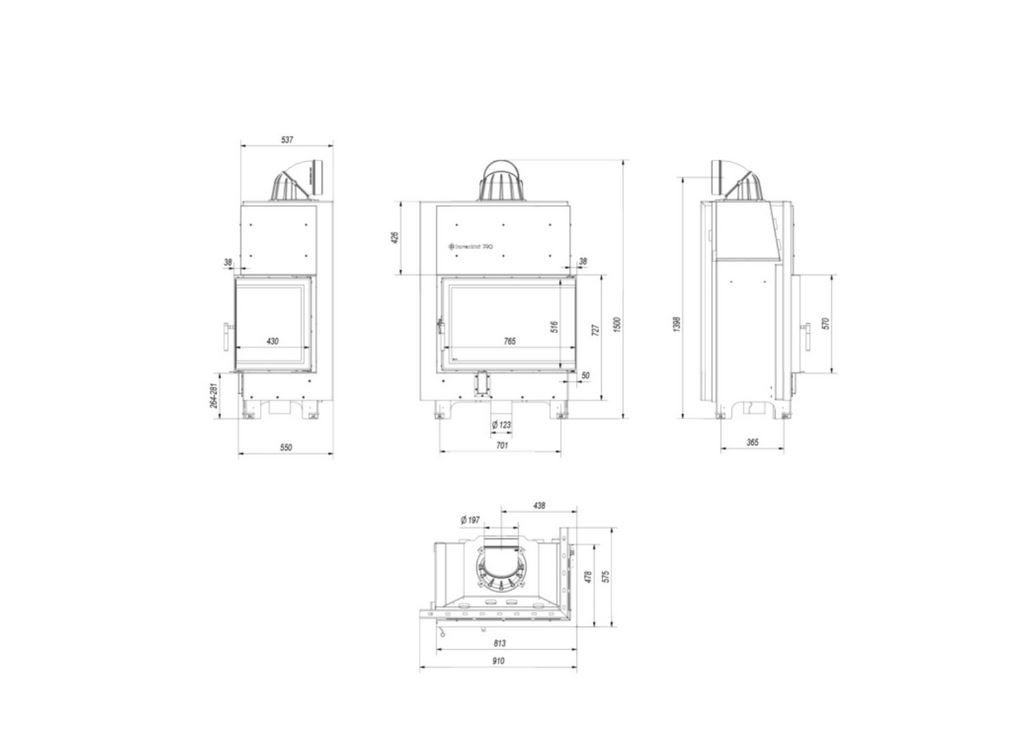 Focarul este echipat cu racord pentru admisie al aerului din exterior de fi 125mm. Focarul are un aspect modern si elegant datorita sticlei decorative grafitate rezistenta la 800° C care ofera un aspect modern si elegant, largind vizual partea frontala a focarului. Incinta focarului si usa fabricate din otel refractar de inalta calitate folosit in productie cu o compozitie ridicata de carbon, pentru o rezistenta mare la temperaturi inalte. Mai usor de montat multumita picioarelor reglabile si a conului de evacuare din fonta reglabil la 360° C. Reglarea aerului se face cu usurinta doar prin actionarea unui singur regulator care impiedica o utilizare necorespunzatoare.